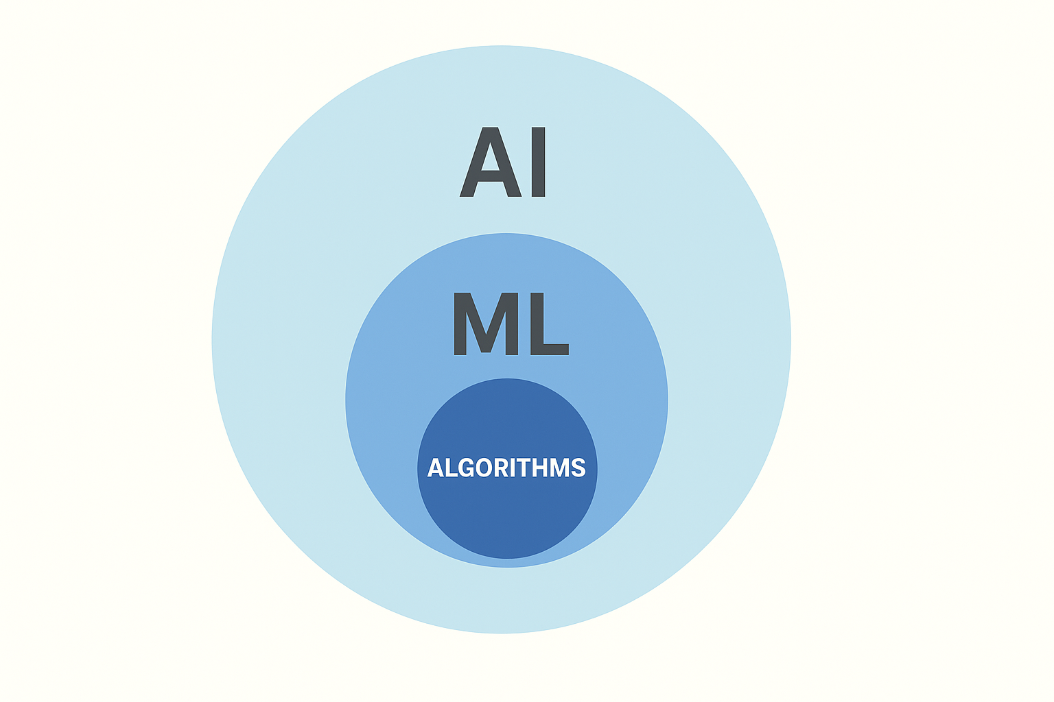 The hierarchical relationship: Algorithms form the foundation, ML is a subset of AI, and AI is the broadest concept#