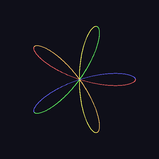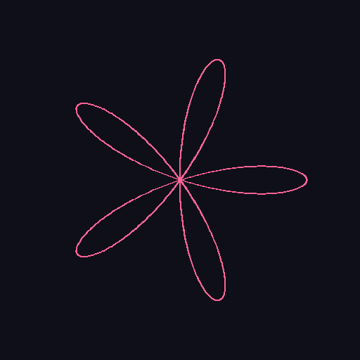 A rose curve with k=5 creates exactly 5 petals. The curve passes through the center where adjacent petals meet.#