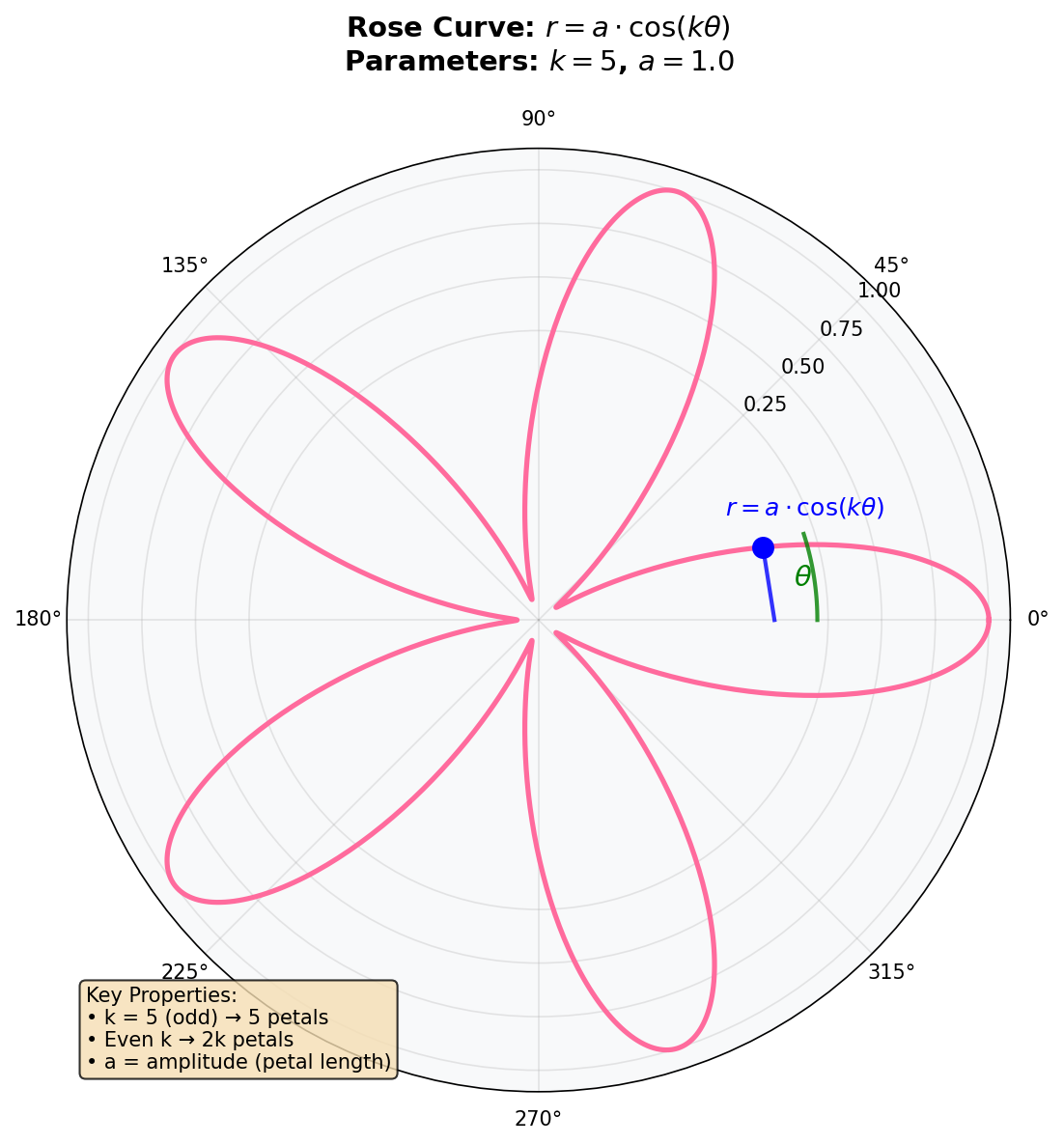 Understand the rose curve polar equation: r = a * cos(k * theta)