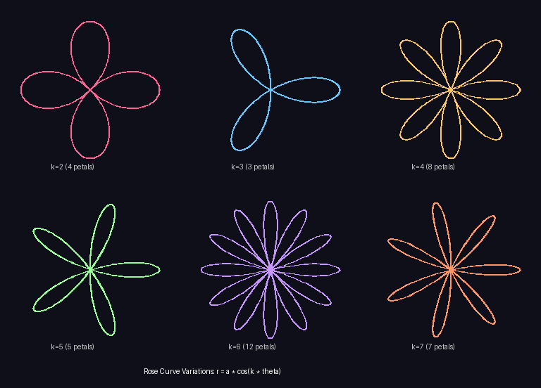 r = a * cos(k * theta)creates flower-like patternsPetal count rule: Odd k produces k petals; even k produces 2k petals