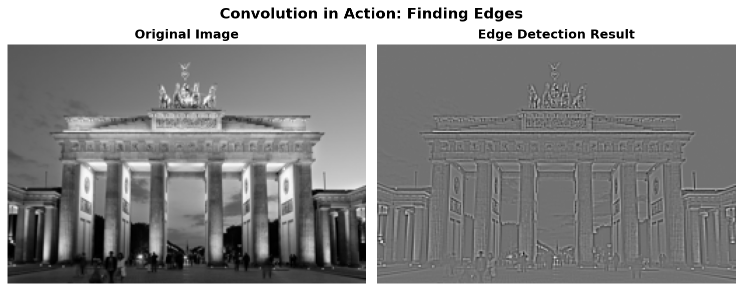Post-processing note: The starter code uses np.clip(result, 0, 255) to handle edge detection’s out-of-range values – this is correct and sufficient. The solution file (convolution_solution.py) uses min-max normalization instead, which reveals faint edges that clipping would discard. See the “Kernel normalization matters!” note in Core Concept 2 for details on when each approach is appropriate.