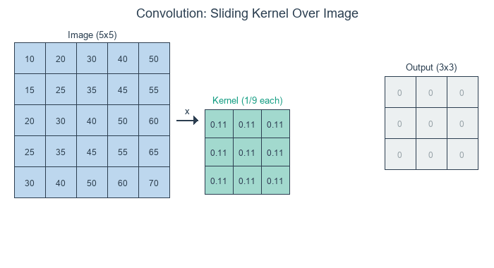 Think of convolution as asking: “What is the weighted average of this pixel’s neighborhood?” The kernel weights define how much each neighbor contributes.