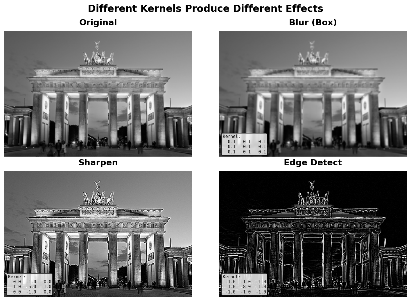 One technical detail: blur kernels should sum to 1, or output brightness will drift. Edge detection kernels sum to 0 by design—they extract differences, not absolute values.
