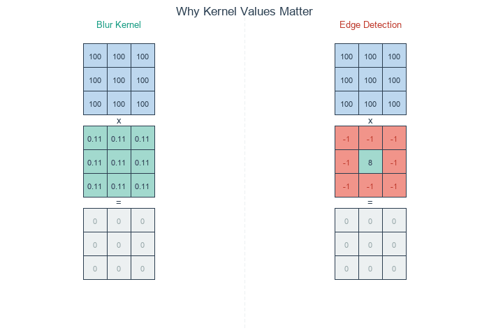 Blur kernel (left) averages all neighbors equally – uniform regions stay bright. Edge detection kernel (right) cancels in uniform regions but responds to intensity changes. Diagram generated with Claude - Opus 4.5.#