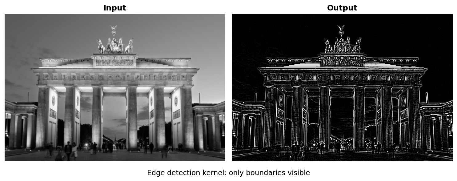 The output will be mostly black with bright white lines where edges exist in the original image. The kernel sums to 0, meaning uniform regions produce zero output (black). Only where pixel values change does the kernel respond. This is the Laplacian edge detector [Marr1980].