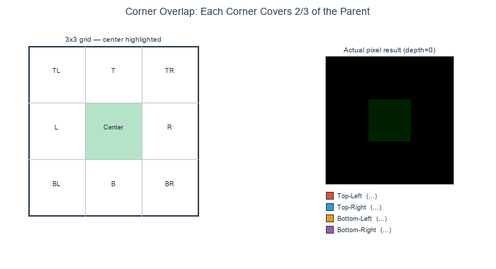 What you need to know: Each corner covers two-thirds of the parent region in both dimensions. The corners overlap with the center square, which is what creates the nested pattern.