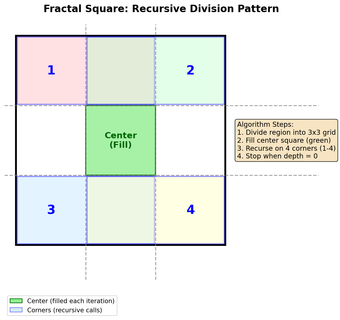 depthparameter stops it from running forever.The fractal square divides each region into a 3x3 grid, fills the center, and recurses on the four corners. Those corners overlap, which is why the output shows a nested structure.