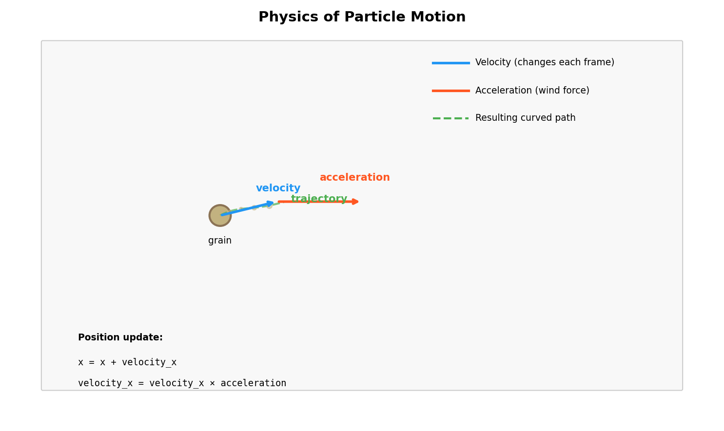 Our particles move according to simple physics: position changes by velocity, and velocity changes by acceleration. This is called Euler integration, one of the simplest methods for simulating motion.