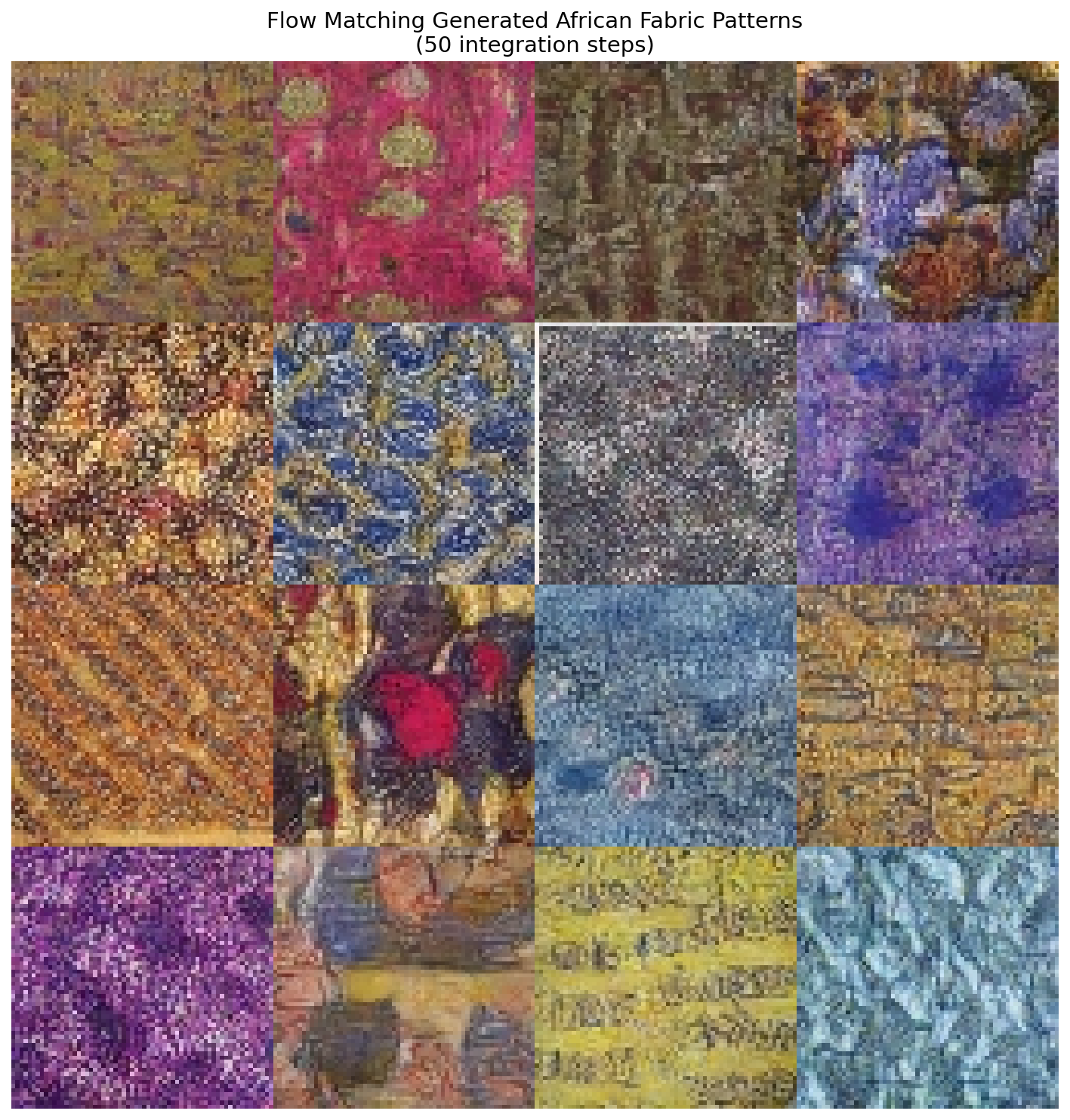 16 African fabric patterns generated by Flow Matching in just 50 ODE integration steps. Compare with DDPM output from Module 12.3.1 which requires 250+ steps.#