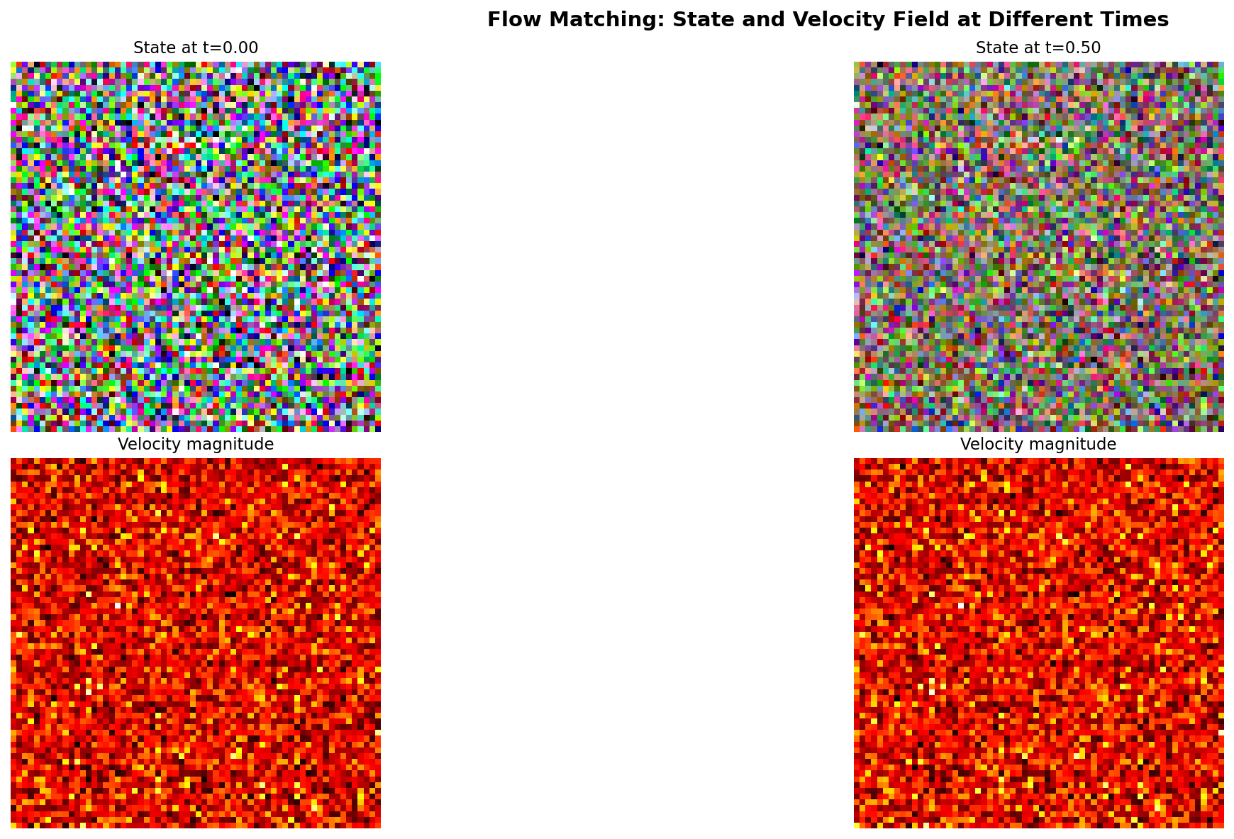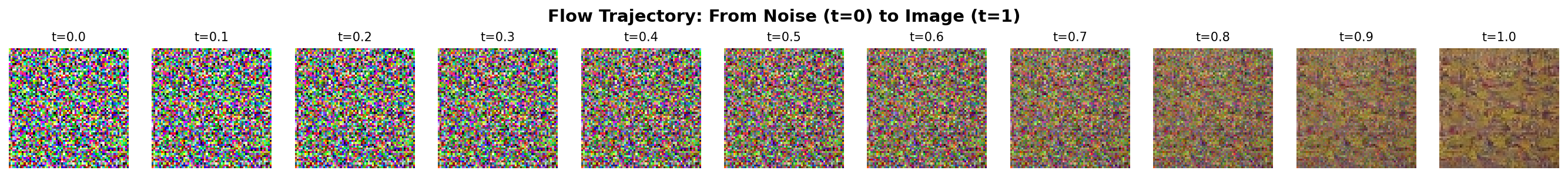 Flow Matching learns velocity fields: Instead of predicting noise like DDPM, we predict the direction from noise to data