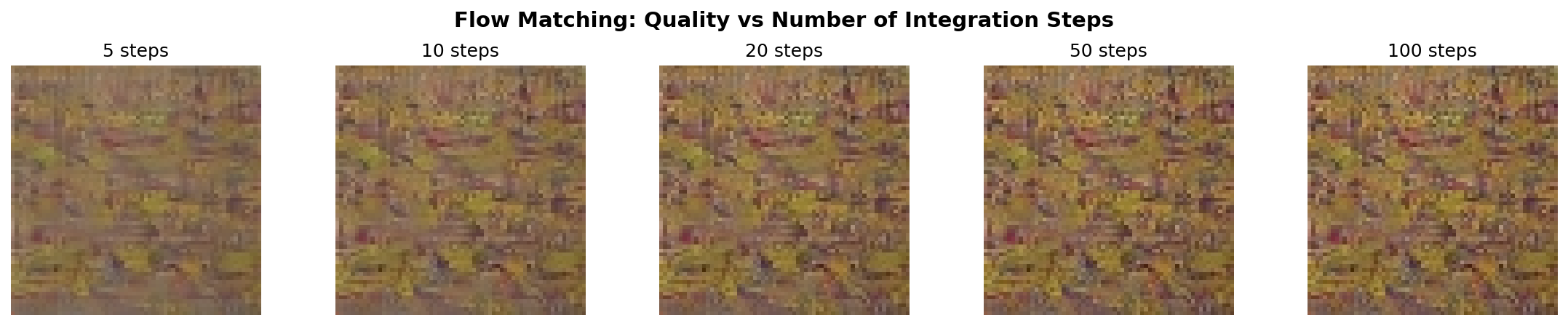 Using too few steps: While Flow Matching needs fewer steps than DDPM, using fewer than 10 may produce artifacts