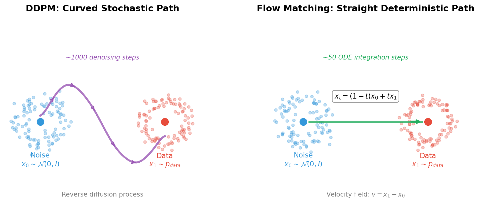 Left: DDPM follows a curved, stochastic trajectory requiring ~1000 denoising steps. Right: Flow Matching follows a straight, deterministic path requiring only ~50 ODE integration steps. The linear interpolation formula \(x_t = (1-t)x_0 + tx_1\) defines the optimal transport path.#