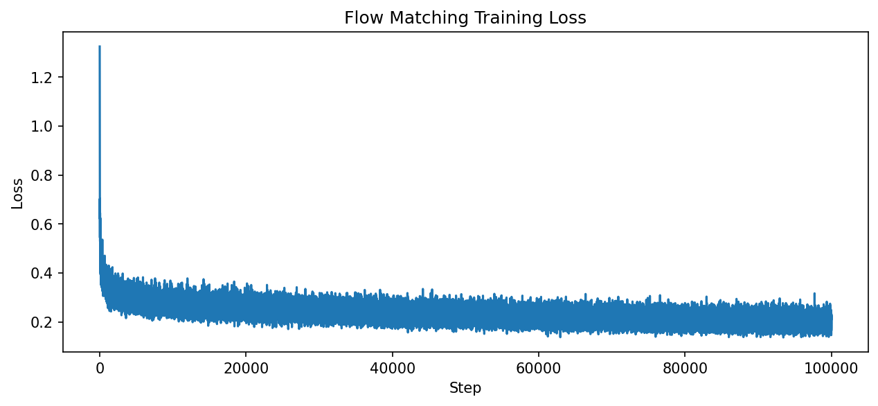 Training loss decreased steadily from 0.29 to 0.20 over 100,000 steps (1.68 hours on RTX 5070Ti). Unlike GANs, Flow Matching training is stable without mode collapse or oscillation.#